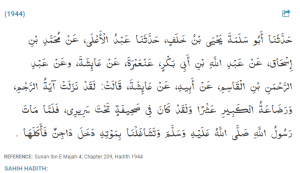 It was narrated that ‘Aishah said: “The Verse of stoning and nursing an adult was revealed ten times, and the paper was with me under my pillow. When Allah’s Messenger died, we were worried about her death, and a tame sheep came in and ate her. “1: These verses were abrogated in recitation but not in rule. Other hadiths state the number for nursing an adult to be five times.